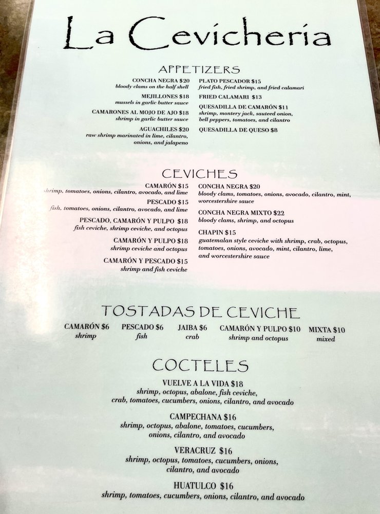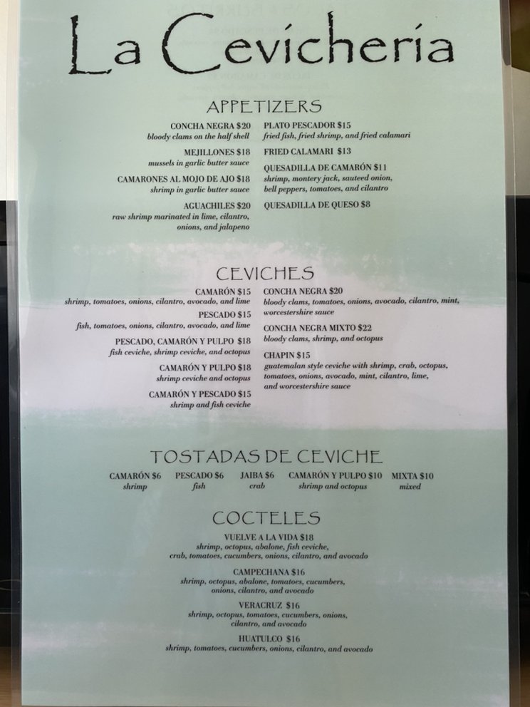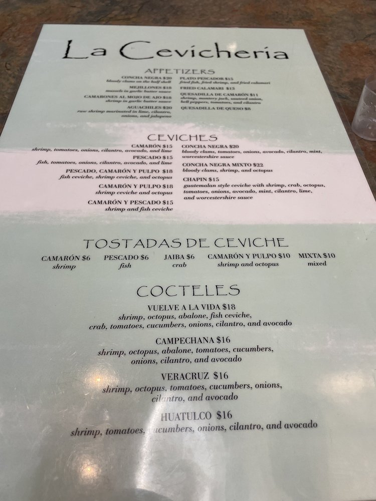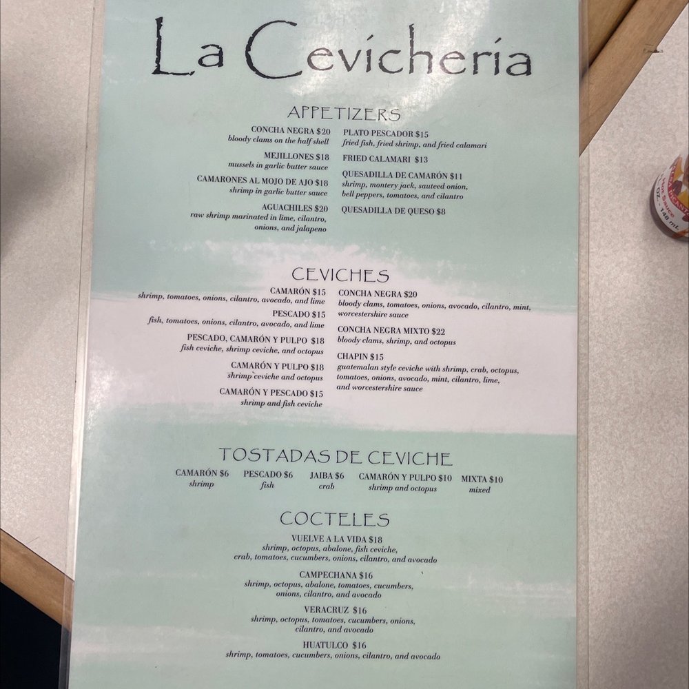 La Cevicheria is a Latin American seafood restaurant located at 3809 W Pico Blvd Los Angeles, CA. This Latinx-owned establishment offers a variety of appetizers, ceviches, and beverages, with many vegetarian options available. The menu includes dishes like Aguachiles, Camaron Ceviche, and Concha Negra Ceviche, showcasing a blend of flavors and textures. Customers have praised the fresh ingredients, friendly service, and the unique experience of dining at La Cevicheria. The restaurant is cash-only but provides options like Zelle for payments. Prices are moderate, but portion sizes are noted to be smaller. The highlight of the menu is the Concha Negra, featuring bloody clams on the half shell, delivering a unique and flavorful experience. Whether you're looking for a casual lunch spot or a place for a group gathering, La Cevicheria offers a cozy and welcoming atmosphere with gender-neutral restrooms and outdoor seating options.
